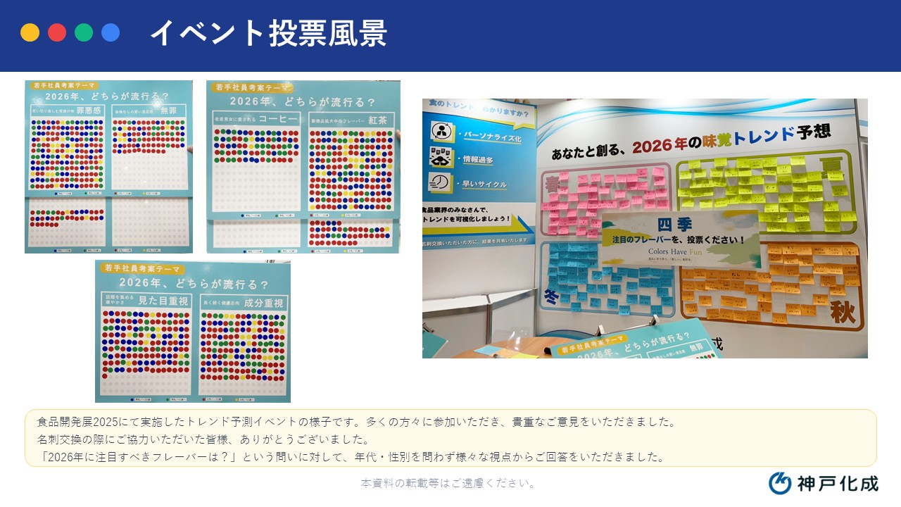 食品開発展2025にて、神戸化成ブースにお立ち寄りいただいた皆様を対象に、今後の商品開発にご参考いただける「トレンド予測アンケート」を実施しました。 本資料では、会場で集めたリアルな投票結果と、そこから見えた2026年の市場を勝ち抜くヒントを公開します。(全11ページ)