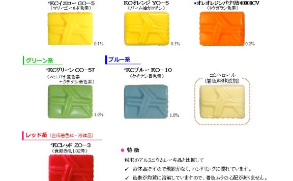 各色の製品を使用し、和菓子の練り切りを着色いたしました。 色のイメージ、添加量の参考にご利用ください。 …